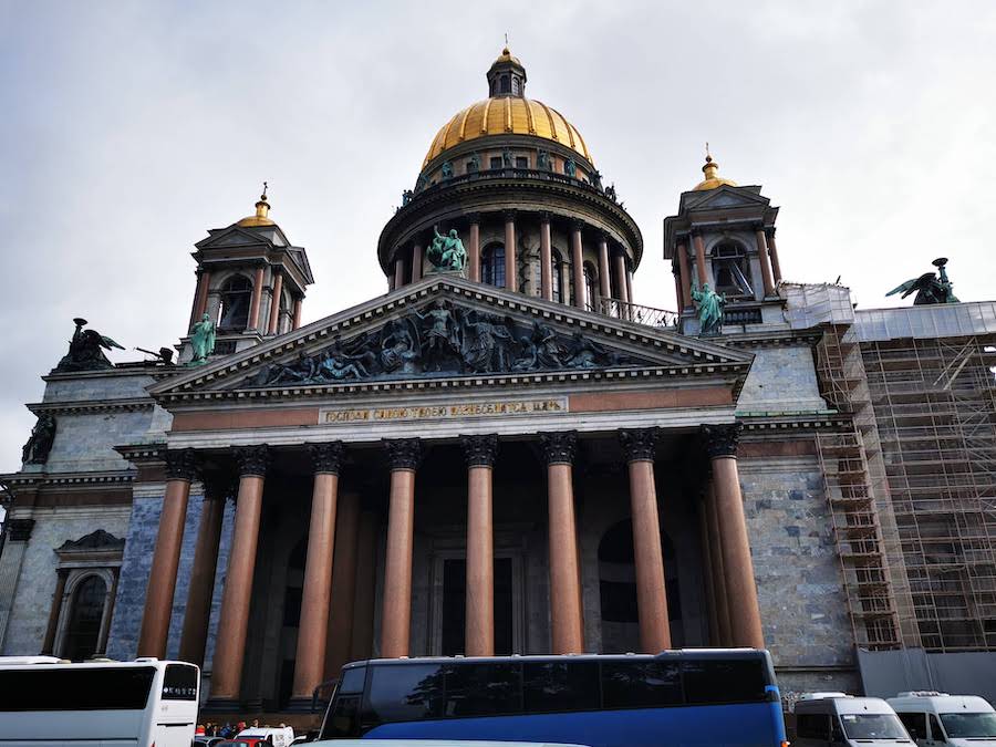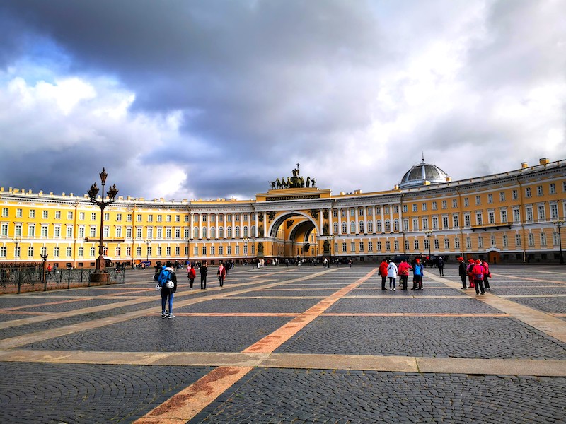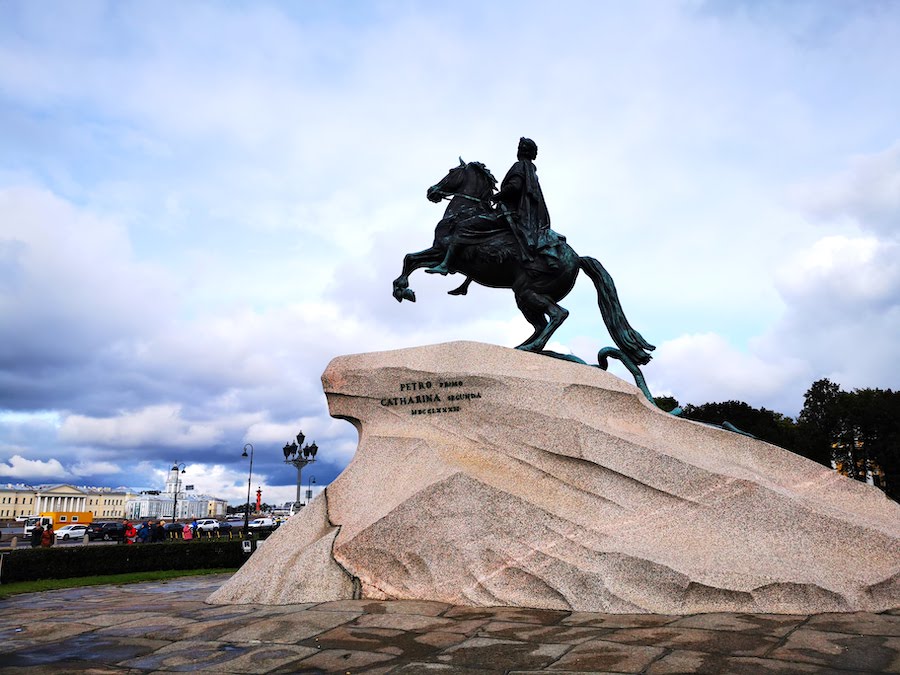 An der Isaakskathedrale konnten wir aus dem Bus aussteigen. Von dort ging es weiter zum Dekabristenplatz mit dem Denkmal „Eherner Reiter“. Danach spazierten wir ein Stück entlang des Flusses Neva und weiter zum riesigen Schlossplatz. Dort befinden sich die berühmten Sehenswürdigkeiten wie das Winterpalais, das Generalstabsgebäude, die Admiralität sowie die Alexandersäule. Die beliebte Eremitage sahen wir so immerhin von außen.