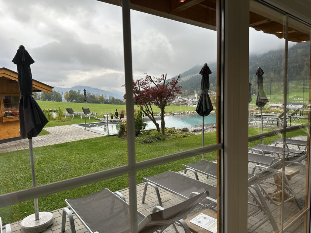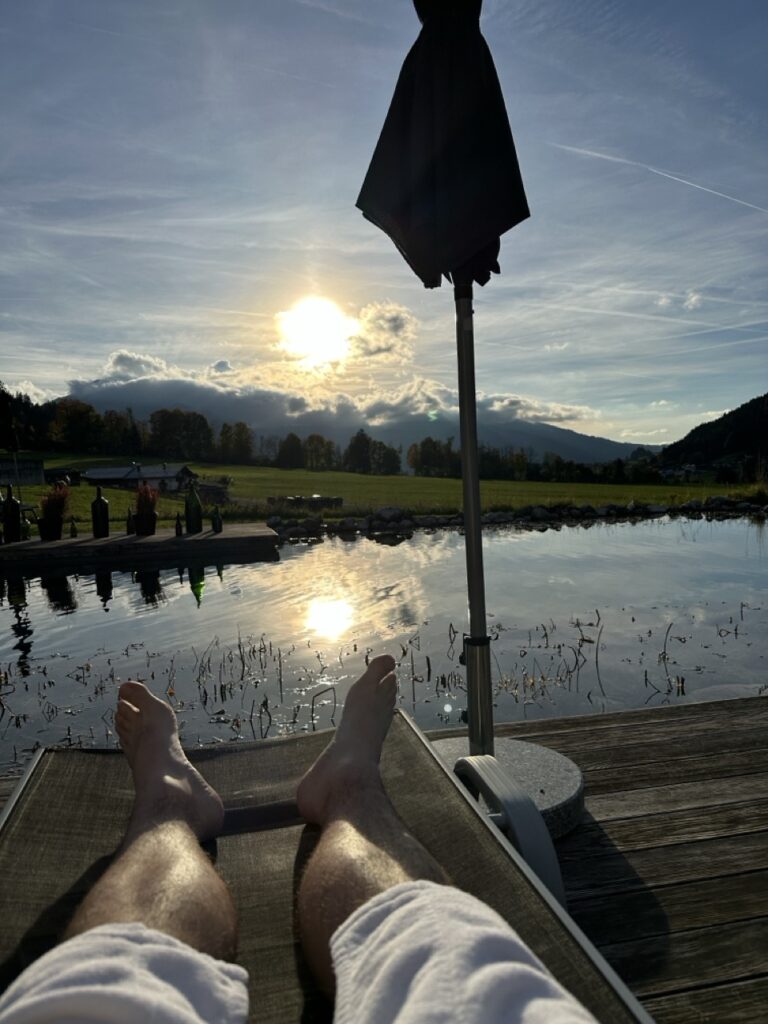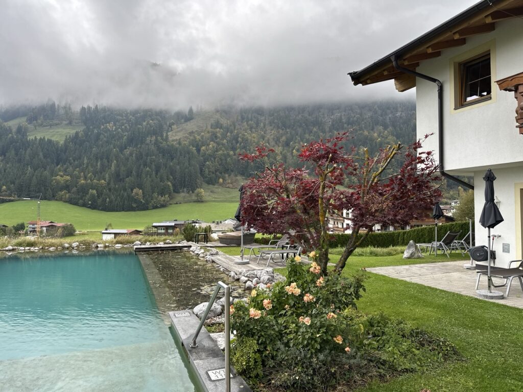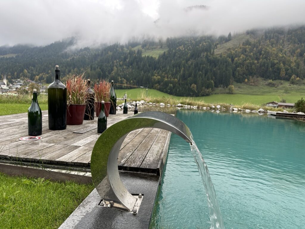Das kristallklare Wasser wird durch natürliche Pflanzen und Kieselgesteine gefiltert und lädt im Sommer zu einem erfrischenden Bad mit Bergblick ein. Allerdings ist das Wasser auch eiskalt. Wir sprangen nur kurz zum Abkühlen nach einem heißen Saunagang in den Naturpool. Rundherum erstreckt sich eine gepflegte Gartenanlage mit bequemen Sonnenliegen – ideal zum Entspannen, Lesen oder einfach zum Nichtstun.