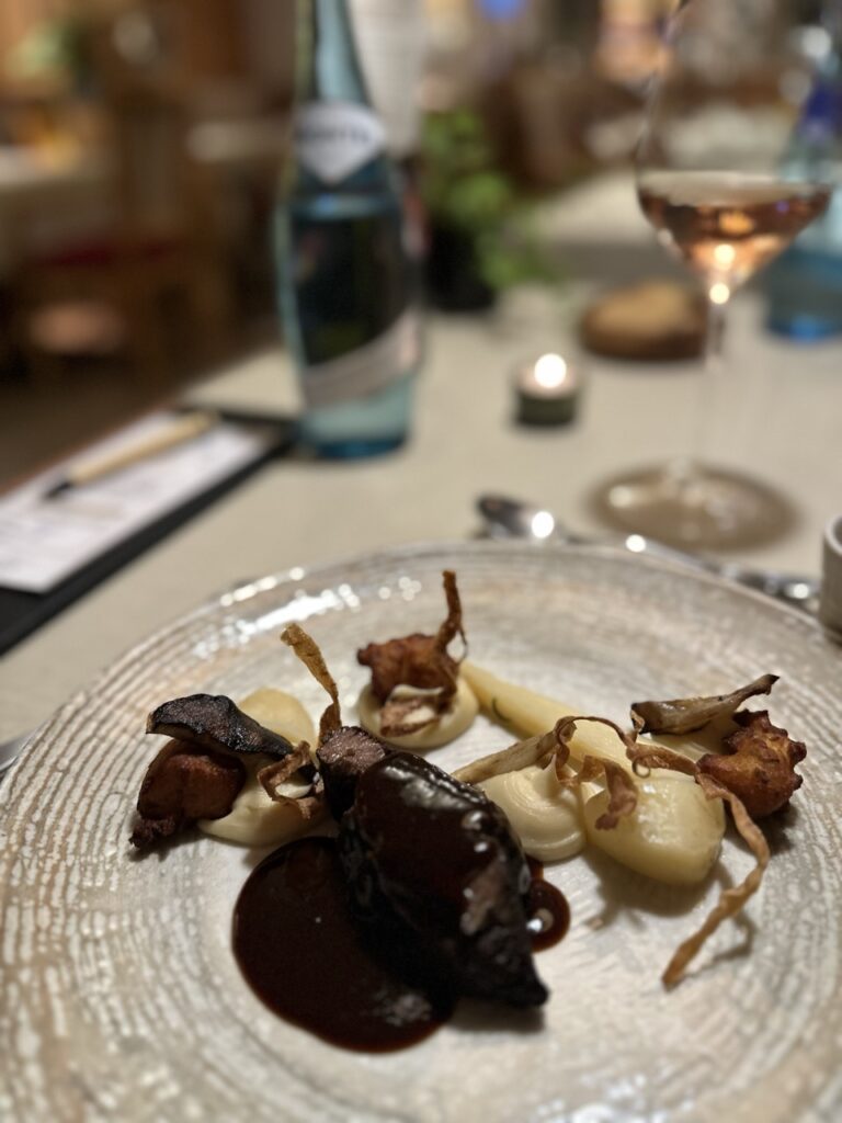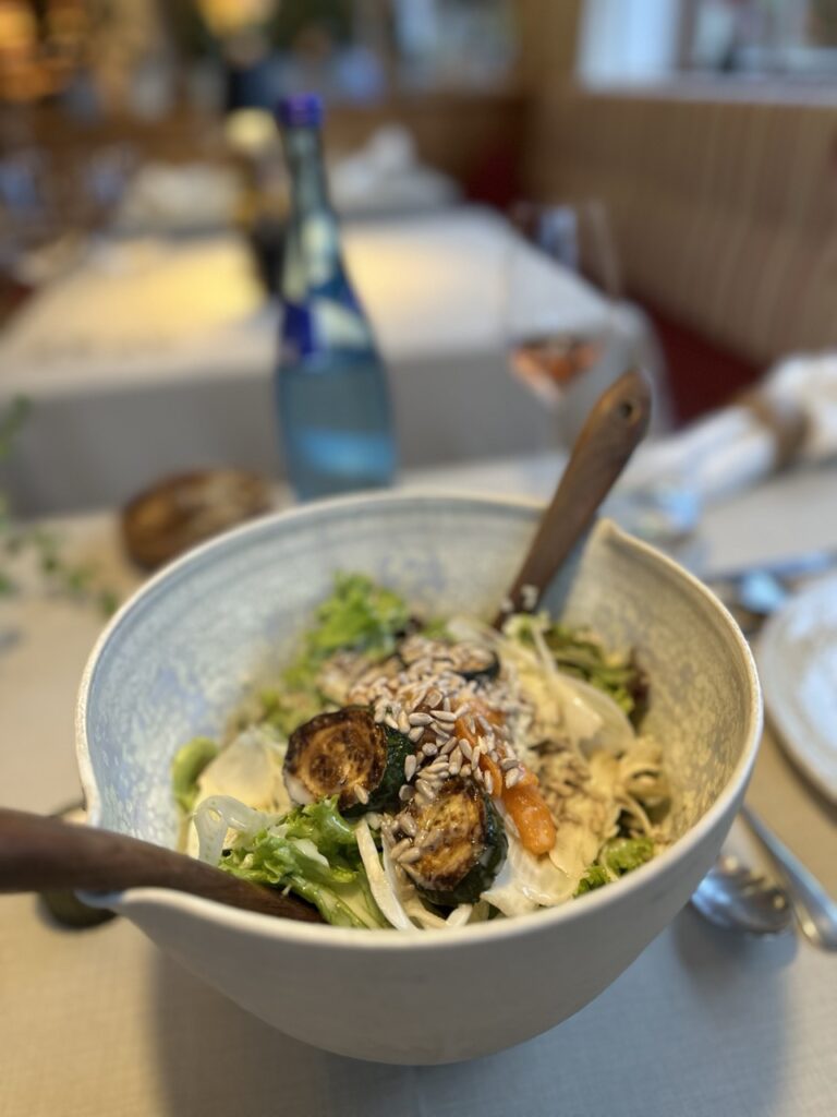 Am Abend folgt das kulinarische Highlight: ein 6-Gänge-Menü, das mit einer knackigen Salatbowl beginnt und von einem kleinen Smoothie begleitet wird. Danach wählt man aus zwei Vorspeisen, drei Hauptgängen (Fleich, Fisch und vegetarisch) sowie zwei Desserts jene Kombination, die einem am meisten zusagt. Diese Auswahl trifft man ebenfalls ganz entspannt bereits am Vortag. Zum Abschluss wartet eine feine Käseplatte, die den Abend harmonisch abrundet.