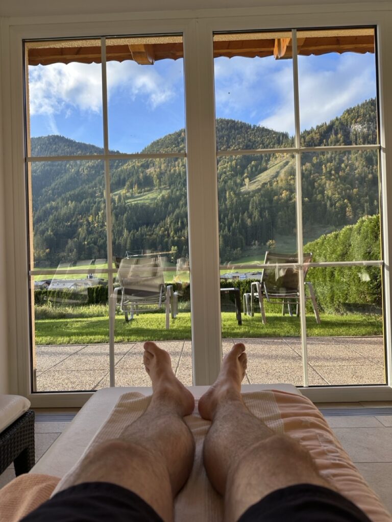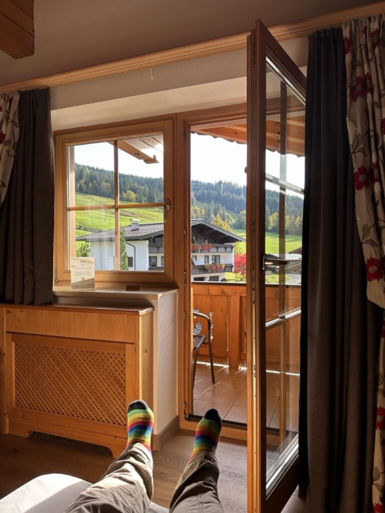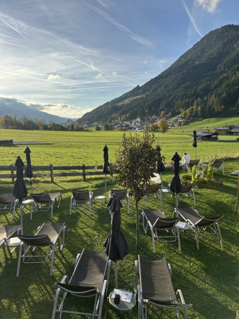 Von unserem Zimmer (mit Balkon) hatten wir einen romantischen Ausblick auf die benachbarten Bauernhöfe, grüne Almwiesen und sogar das Jakobskreuz auf der Buchensteinwand. Das Ambiente verbindet modernes Design mit Tiroler Charme: warme Holztöne, natürliche Materialien und ein Stil, der zugleich edel und entspannt wirkt. Überall finden sich kleine Akzente, die zeigen, dass hier Menschen mit Geschmack und Herz am Werk sind. „Persönlichkeit statt Perfektion“ lautet das Motto – und das Ergebnis ist eine Atmosphäre, in der man sich sofort willkommen fühlt.