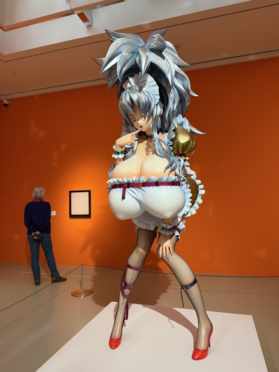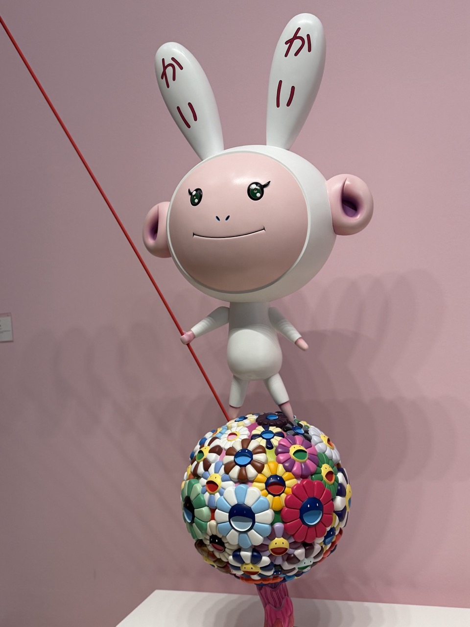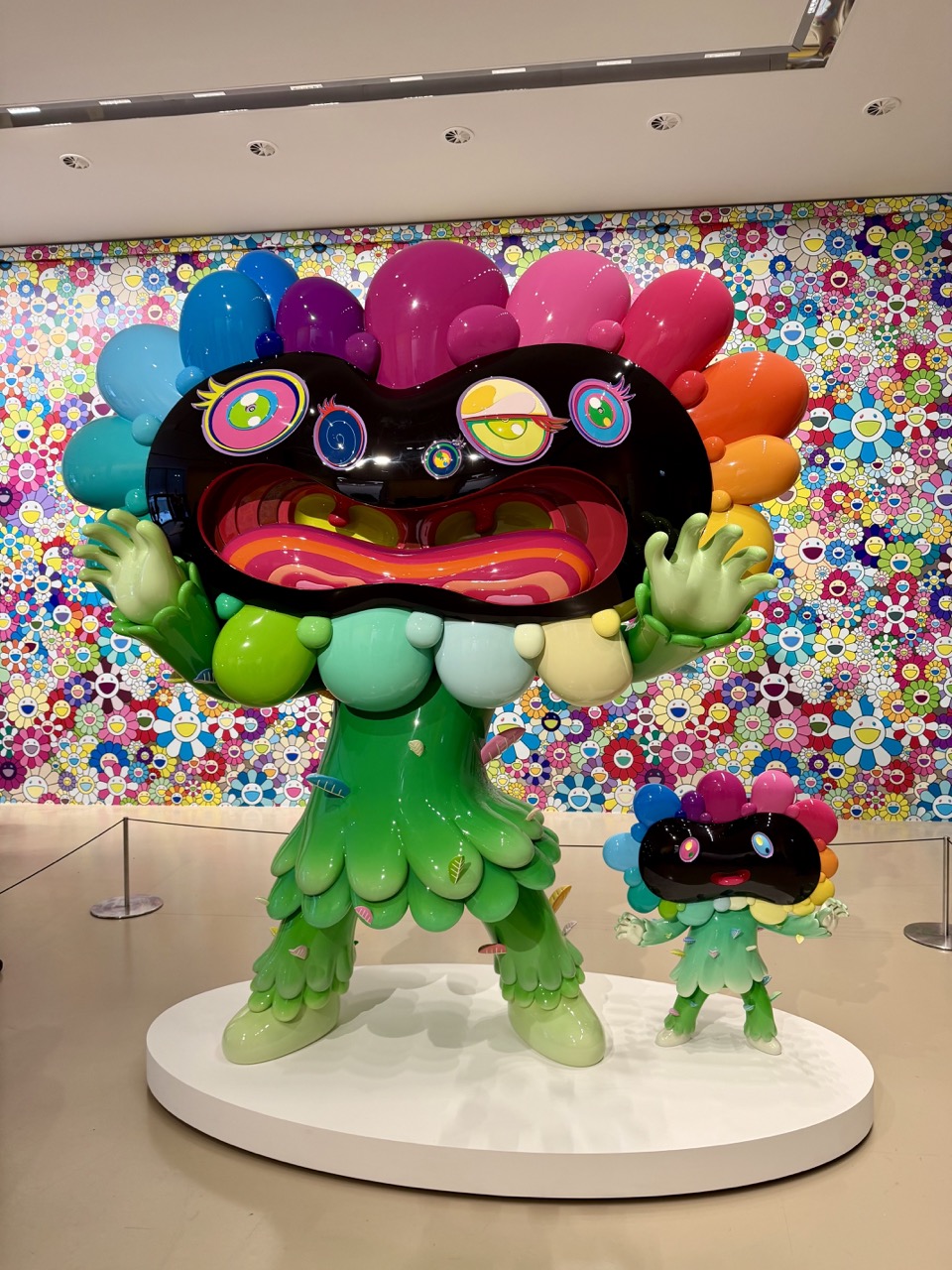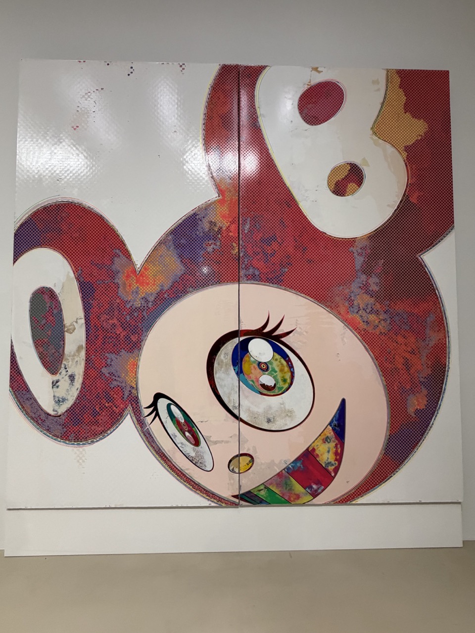 Mein persönliches Highlight der Ausstellung sind die Werke von Takashi Murakami. Der Künstler ist bekannt für seinen „Superflat“-Kunststil, der Popkultur, japanisches Anime und traditionelle Kunstformen kombiniert. Er spielt mit Kunst und Massenkultur, mit Kommerz und Identität sowie mit der Vergänglichkeit hinter der bonbonfarbenen Oberfläche.