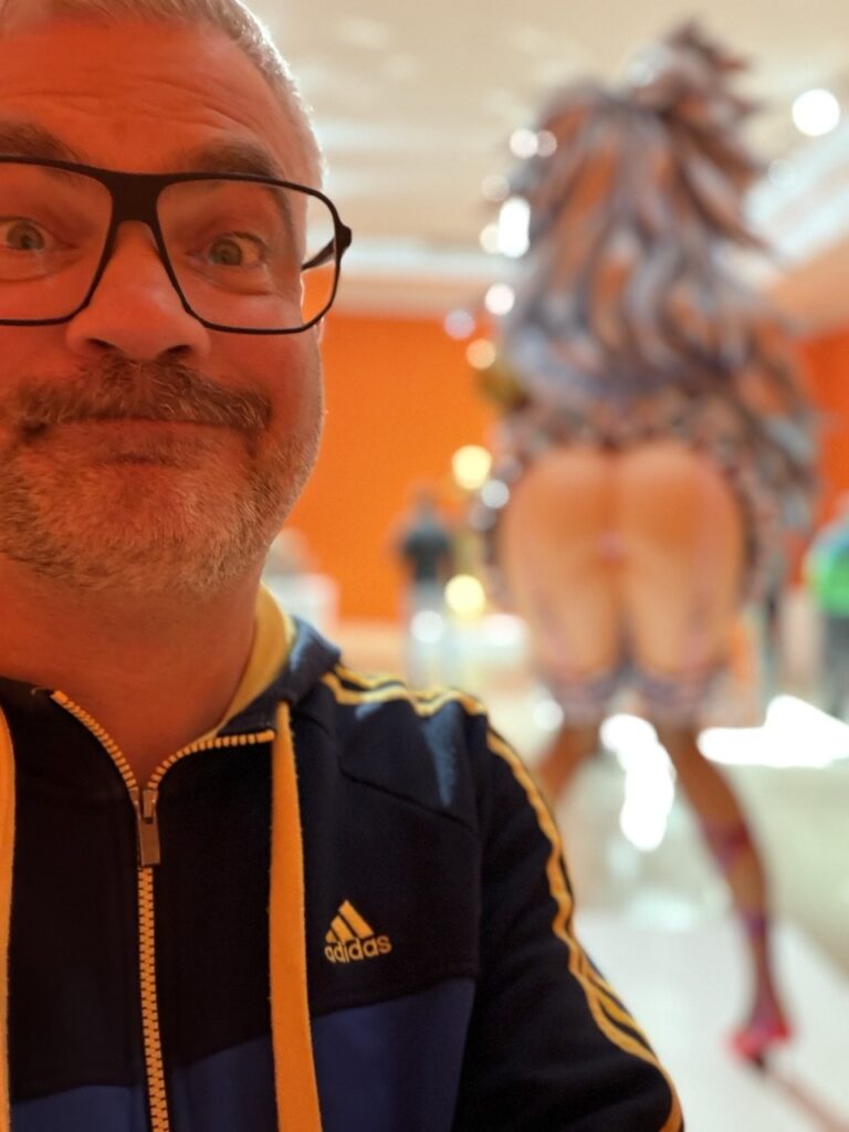Ich mag Kunstausstellungen, durch die man nicht geschniegelt und gestriegelt hindurchschreitet, sondern in denen man stehen bleibt, lacht, sich irritiert und nochmal zurückläuft. Passenderweise hatte ich meinen knallbunten Adidas-Jogginganzug, den ich sonst nur zu Hause auf der Couch trage, selbstbewusst angelassen. Somit war ich fast genauso farbenfreudig wie die ausgestellten Kunstwerke.