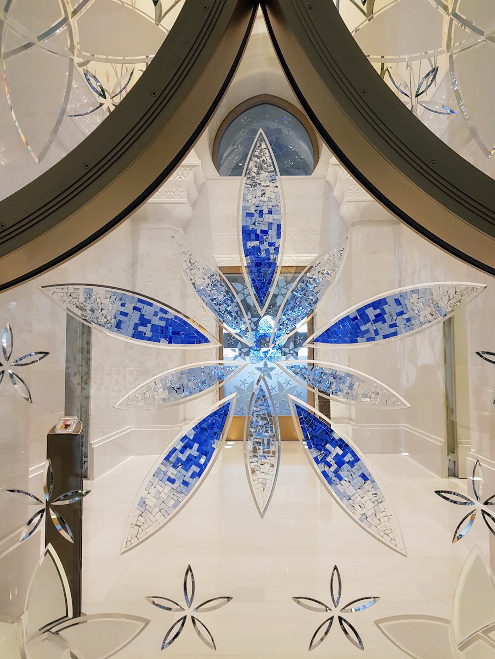Die Sheikh Zayed Moschee wurde nicht nur aus Stein gebaut: Für die Böden und Wandverkleidungen der Moschee wurde feinster Marmor verwendet. Besonders schön finde ich den prunkvollen, riesigen Fußboden mit seinem Blumenmuster aus Marmor. Die kunstvollen Säulen und Wandmalereien sind mit Blattgold verziert. Riesige Kronleuchter schmücken die gewölbten Decken der Kuppeln. In den Gebetsräumen brechen Glasfenster das Licht in den verschiedensten Farben.