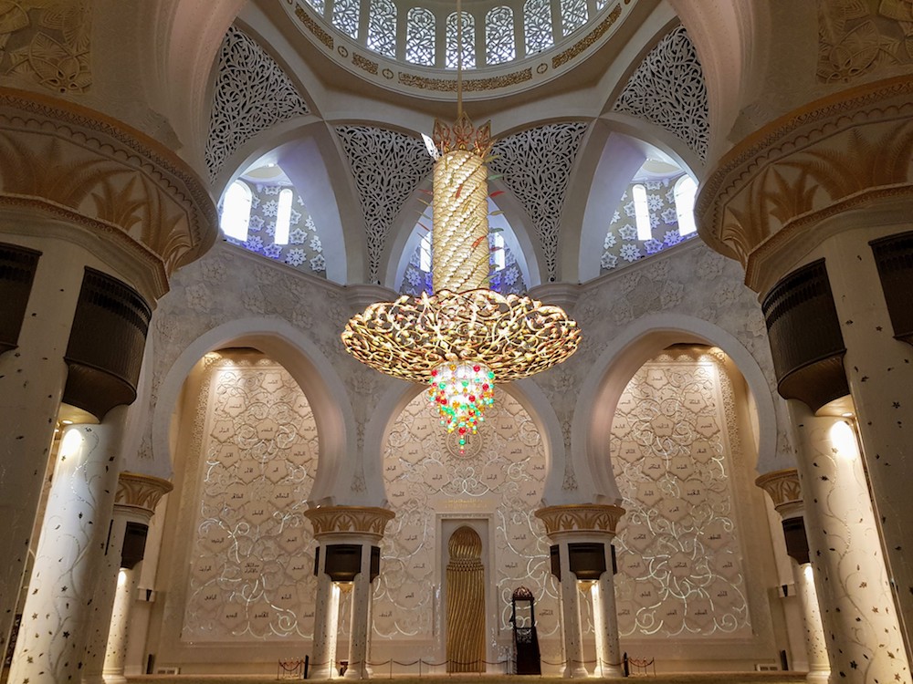 Eine besondere Augenweide sind die sieben Kristalllüster, die aus Deutschland importiert wurden. Sie sind aus vergoldetem Messing und Edelstahl gefertigt und mit unzähligen Swarovski-Kristallen verziert. Eines der Prunkstücke wiegt 12 Tonnen. Er ist der größte Kronleuchter der Welt. Ein weiteres Highlight ist der größte Teppich der Welt. Dieser bildet mit seiner Farbenpracht in feinster Handarbeit einen atemberaubenden Kontrast zu den strahlend weißen Wänden des Sakralbaus.